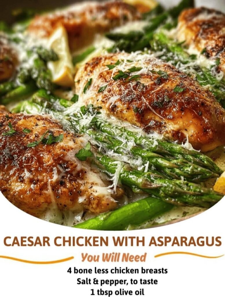 A sun-kissed Mediterranean take on classic Caesar chicken—juicy pan-seared chicken breasts, tender roasted asparagus, bright lemon, garlic, olive oil, and aged Parmesan. This dish is elegant yet comforting, perfect for a family dinner or a special occasion.