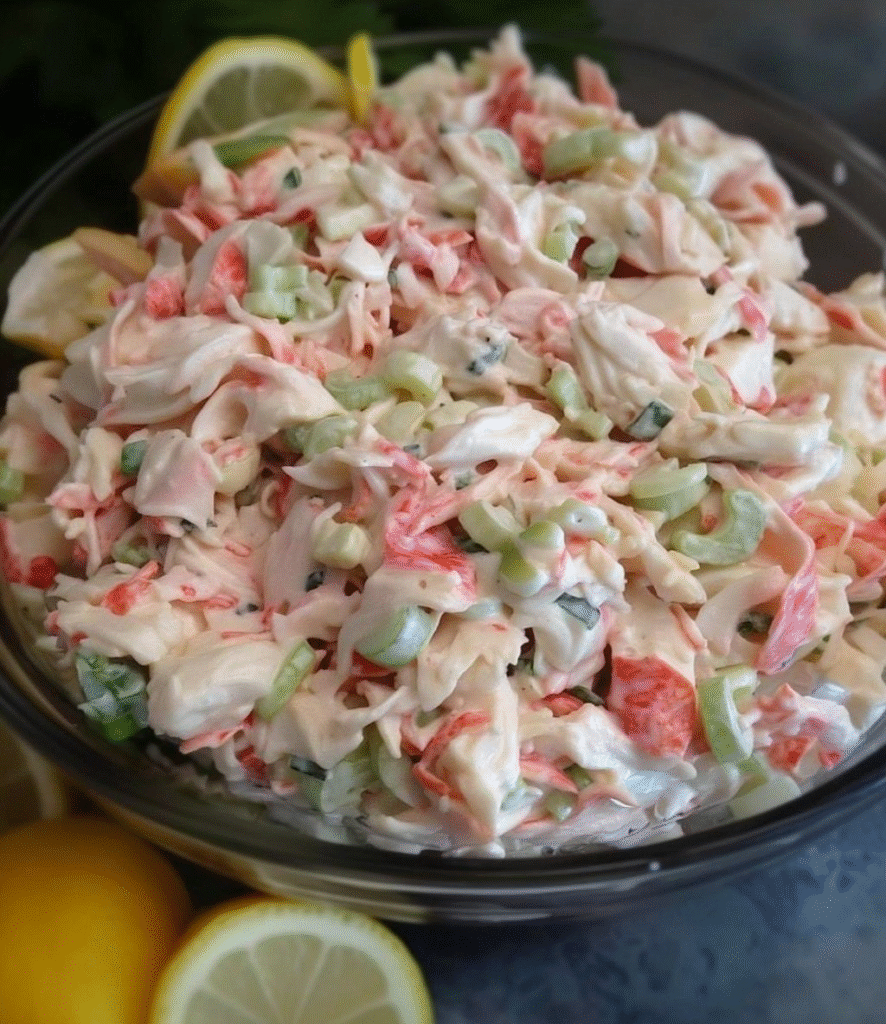 Expect a perfect contrast of textures — tender seafood, crunchy vegetables, and a smooth, creamy dressing. The flavor is light, fresh, and slightly zesty, with the lemon juice cutting through the richness of the mayo and sour cream.