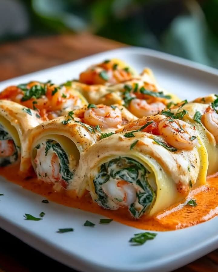 This elegant dish features tender pasta rolls filled with a creamy shrimp and spinach mixture, topped with a rich tomato or Alfredo sauce. It’s perfect for a special dinner or when you want to impress guests!